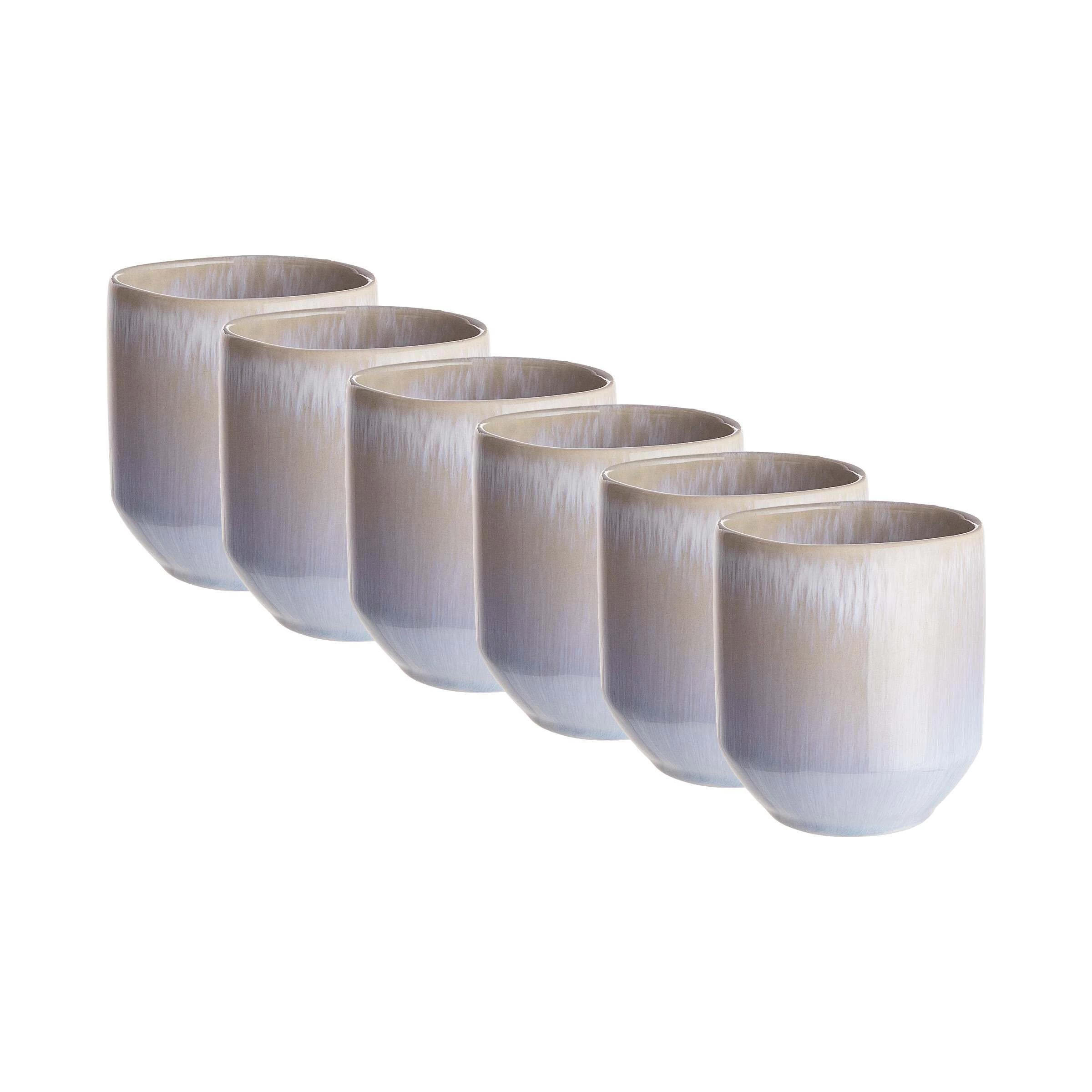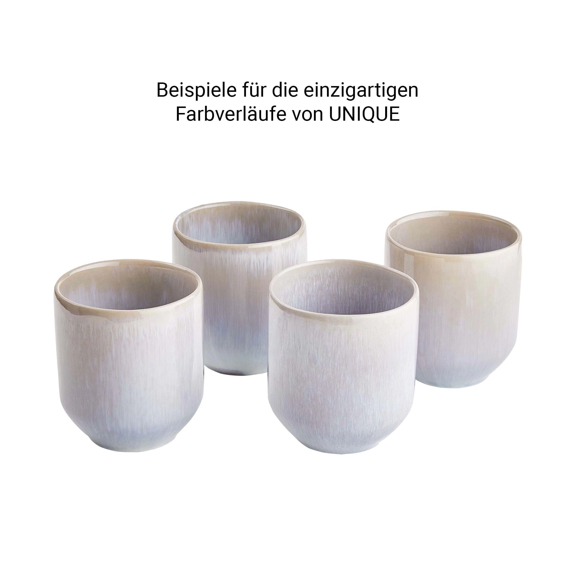 So einzigartig wie Ihr Fingerabdruck: Den Farbverlauf einer Unique Tasse aus Steinzeug werden Sie kein zweites Mal finden. Der wunderschöne Effekt entsteht durch die reaktive Glasur, die jedes Mal ein bisschen anders ausfällt. Modern und besonders ist übrigens auch die schlichte Form der Tassen ohne Henkel, dieses Design darf in angesagten Cafés gerade auf keinem Tisch fehlen. Die Unique Tassen im 6er-Set sind erhältlich in Pastellgelb, Pastellblau, Grau und Dunkelblau – jeweils in zwei Größen. Tipp: Unterschiedliche Farben auf dem gedeckten Tisch kombinieren.