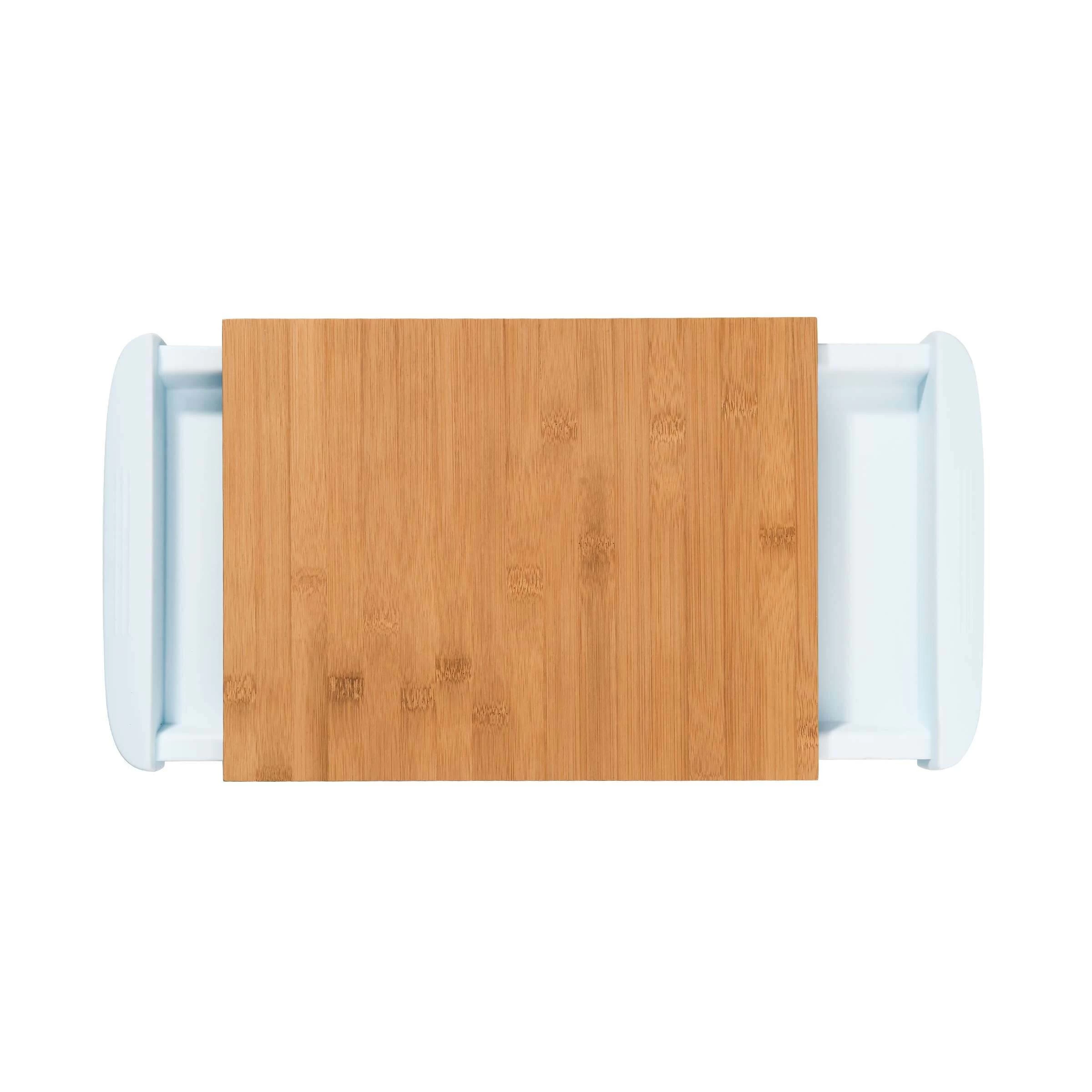 Das Bamboo Bambussbrett mit zwei Auffangschalen aus Kunststoff denkt als Küchenhelfer mit: Nach dem Schneiden lassen sich z. B. Kräuter, Gemüsestückchen oder Zwiebelwürfel schnell und einfach in eine der Schalen befördern – und stehen nun beim Kochen, beim Zubereiten oder am gedeckten Tisch griffbereit.