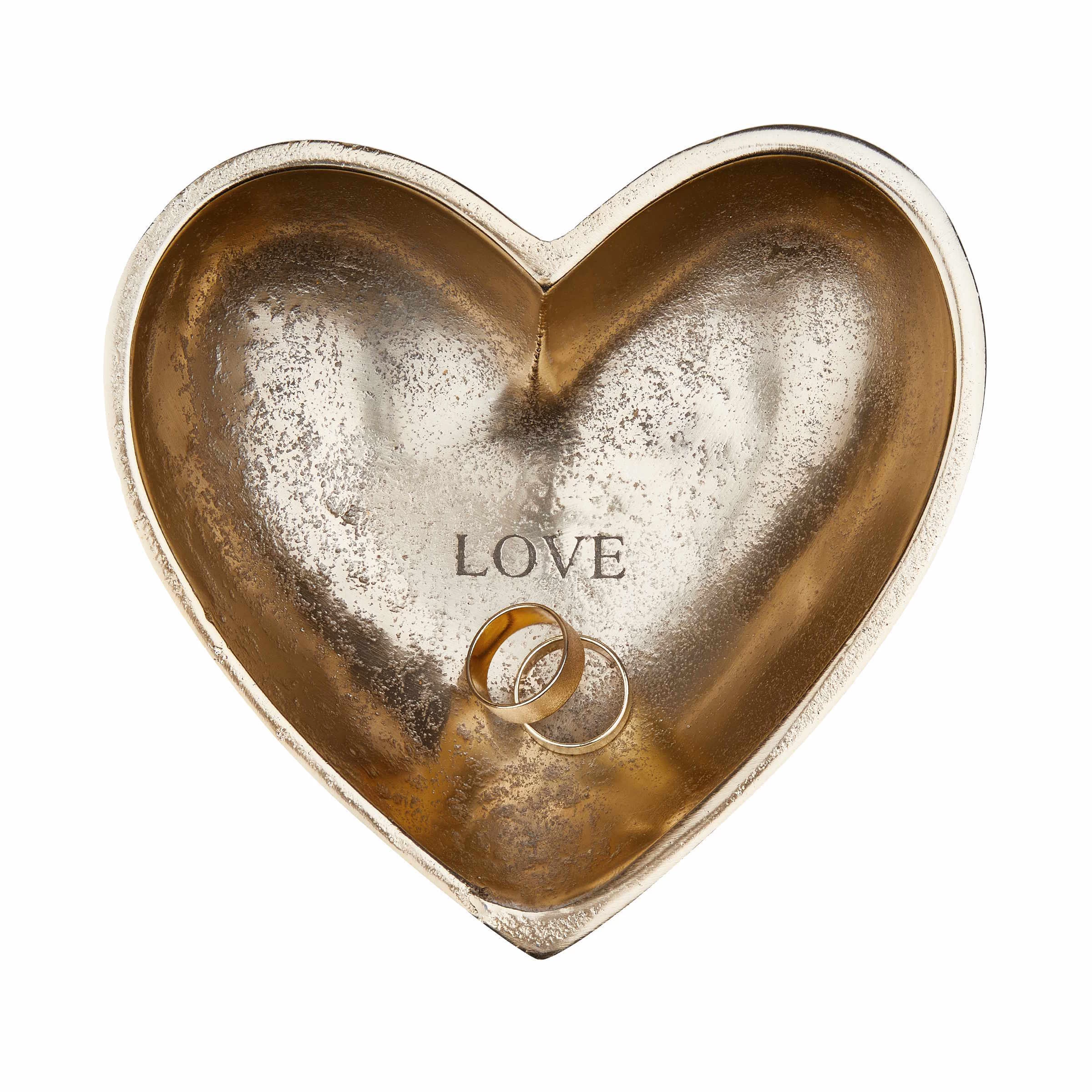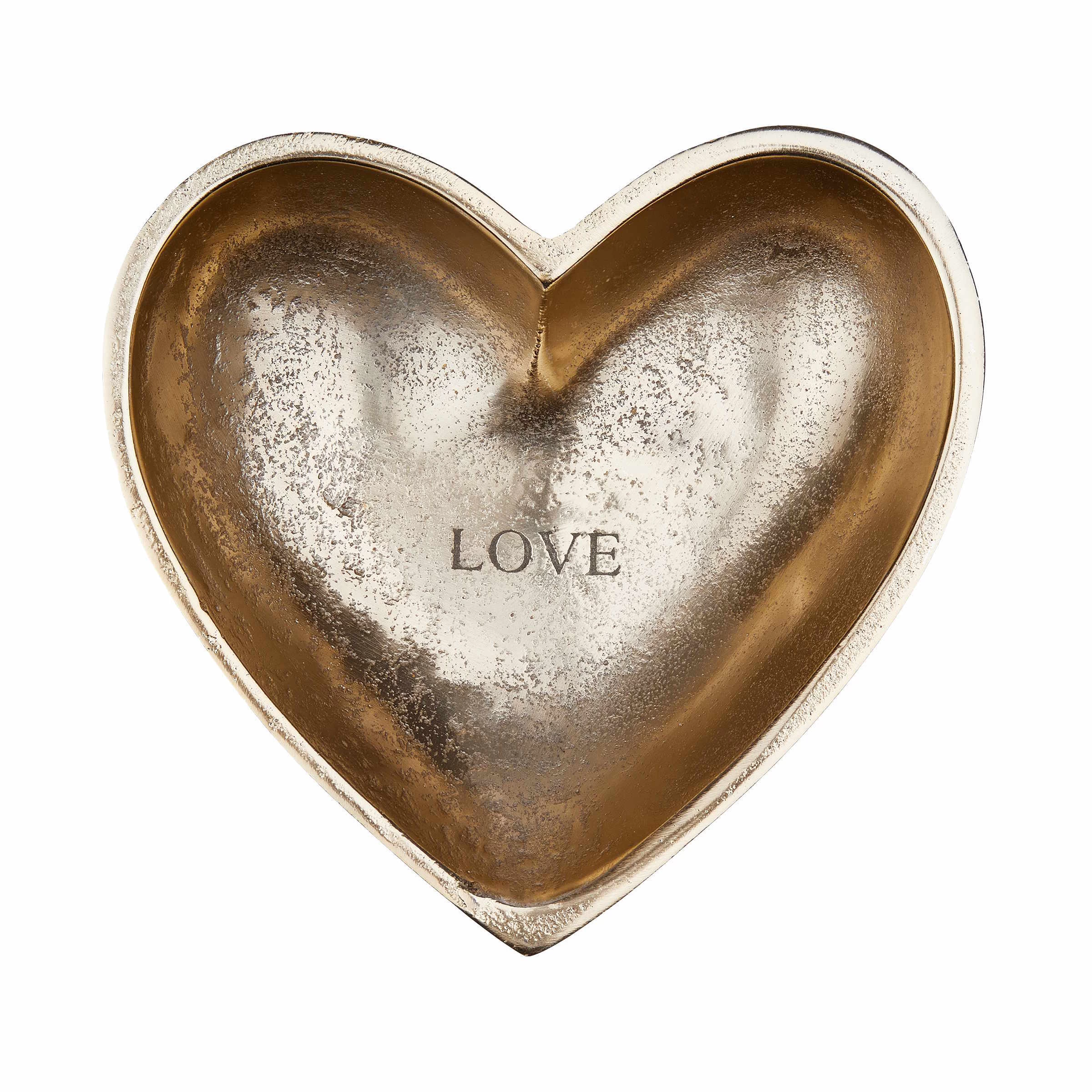 Ein Herz für raffinierte Details beweisen Sie mit der Heart Deko Schale mit Love-Schriftzug aus goldfarbenem Aluminium. Dabei kann diese herzförmige Schale nicht nur dekorativ: Auf dem Schminktisch oder Nachttisch dient sie als Schmuckablage, im Home Office als Sammelstelle für USB-Sticks und andere kleine Utensilien und im Flur finden Schlüssel dort ihren Platz.