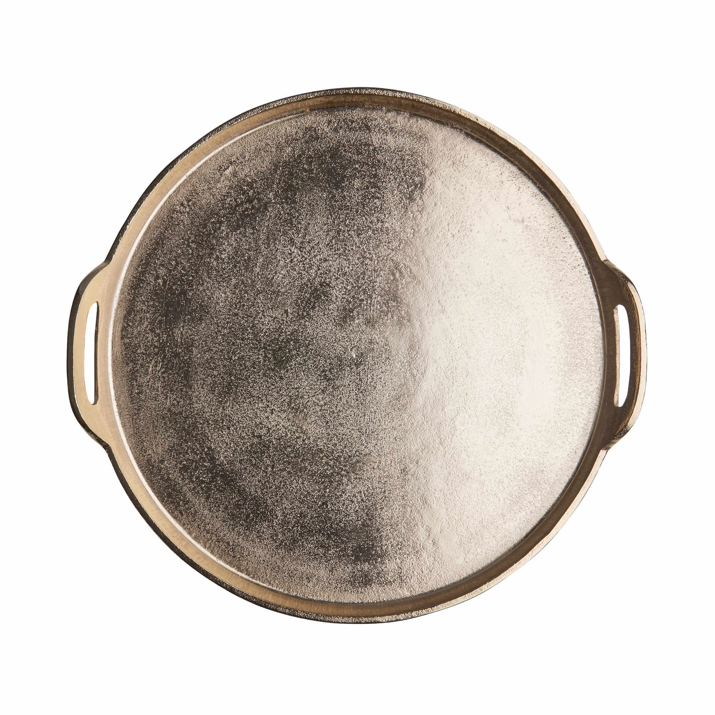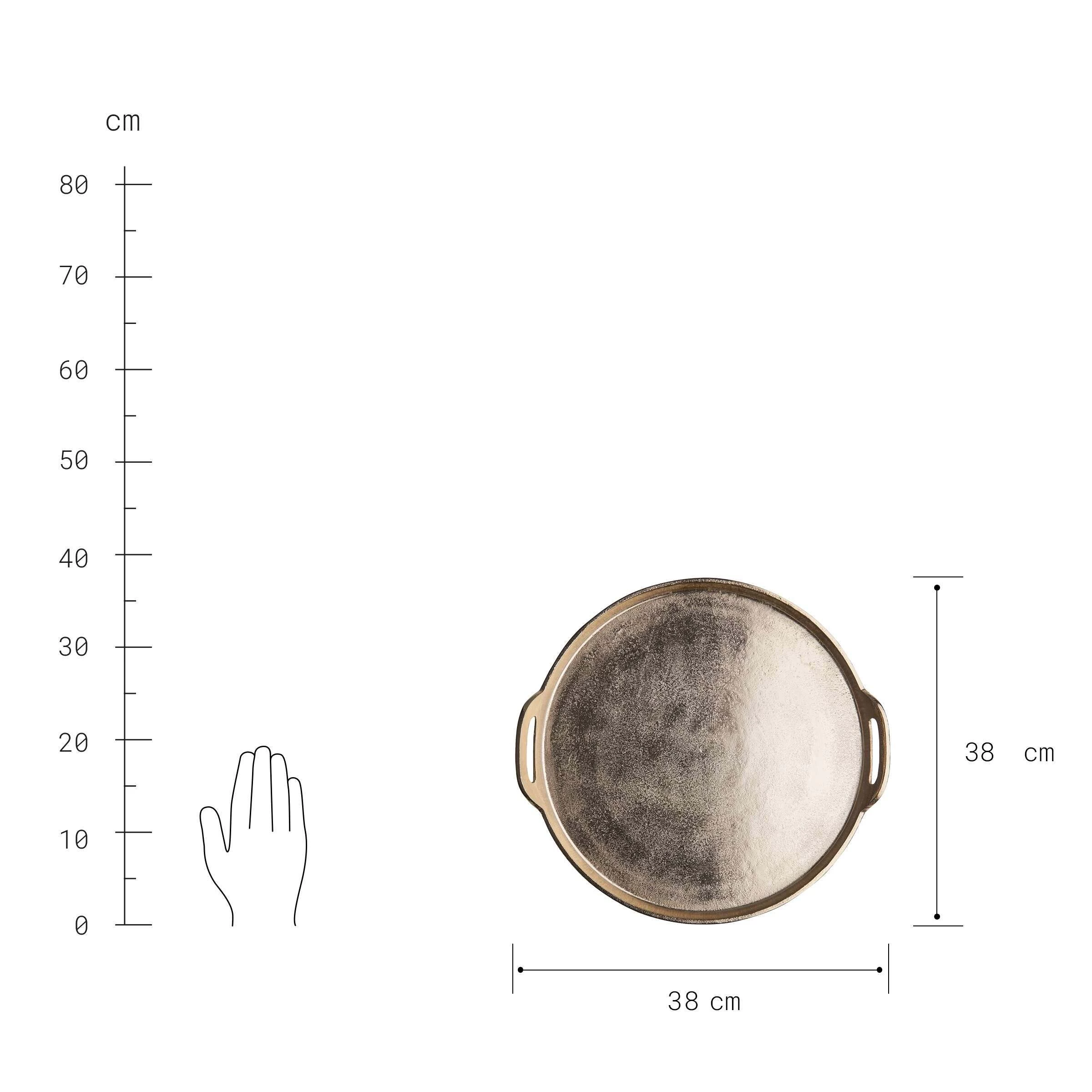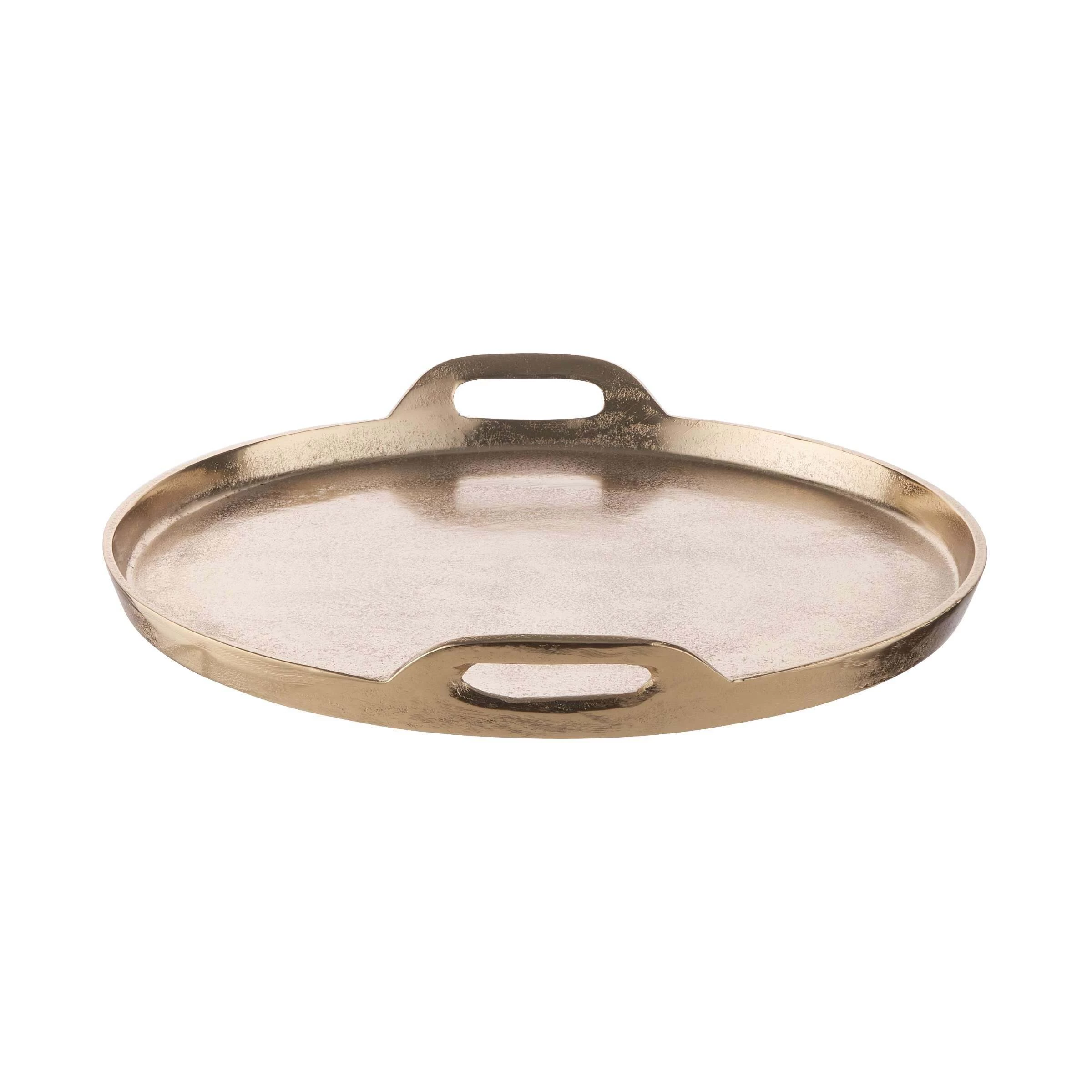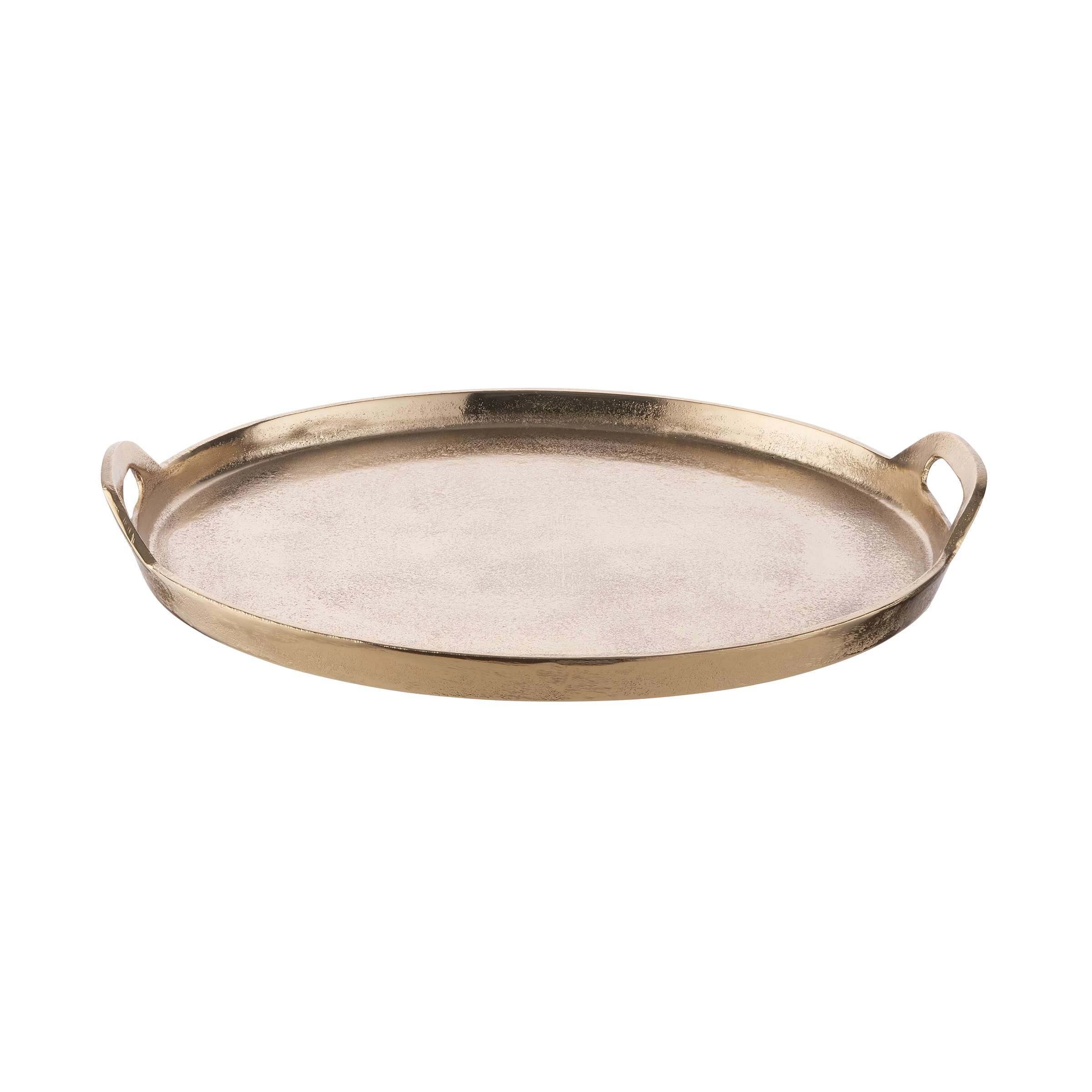 Mit dem Banquet Deko Tablett mit Griffen aus Aluminium in Gold schaffen Sie die elegante Grundlage für Ihre individuelle Deko: Einfach Kerzen, Windlichter, Vasen und andere ausgesuchte Objekte auf dem Tablett anordnen und dann auf einem Beistelltisch oder auf dem Esstisch platzieren. Auf der festlich gedeckten Tafel macht sich das Dekotablett mit 38 cm Durchmesser auch gut als Untersetzer für Flaschen und Karaffen. Mit Filzpunkten an der Unterseite zum Schutz empfindlicher Möbel.