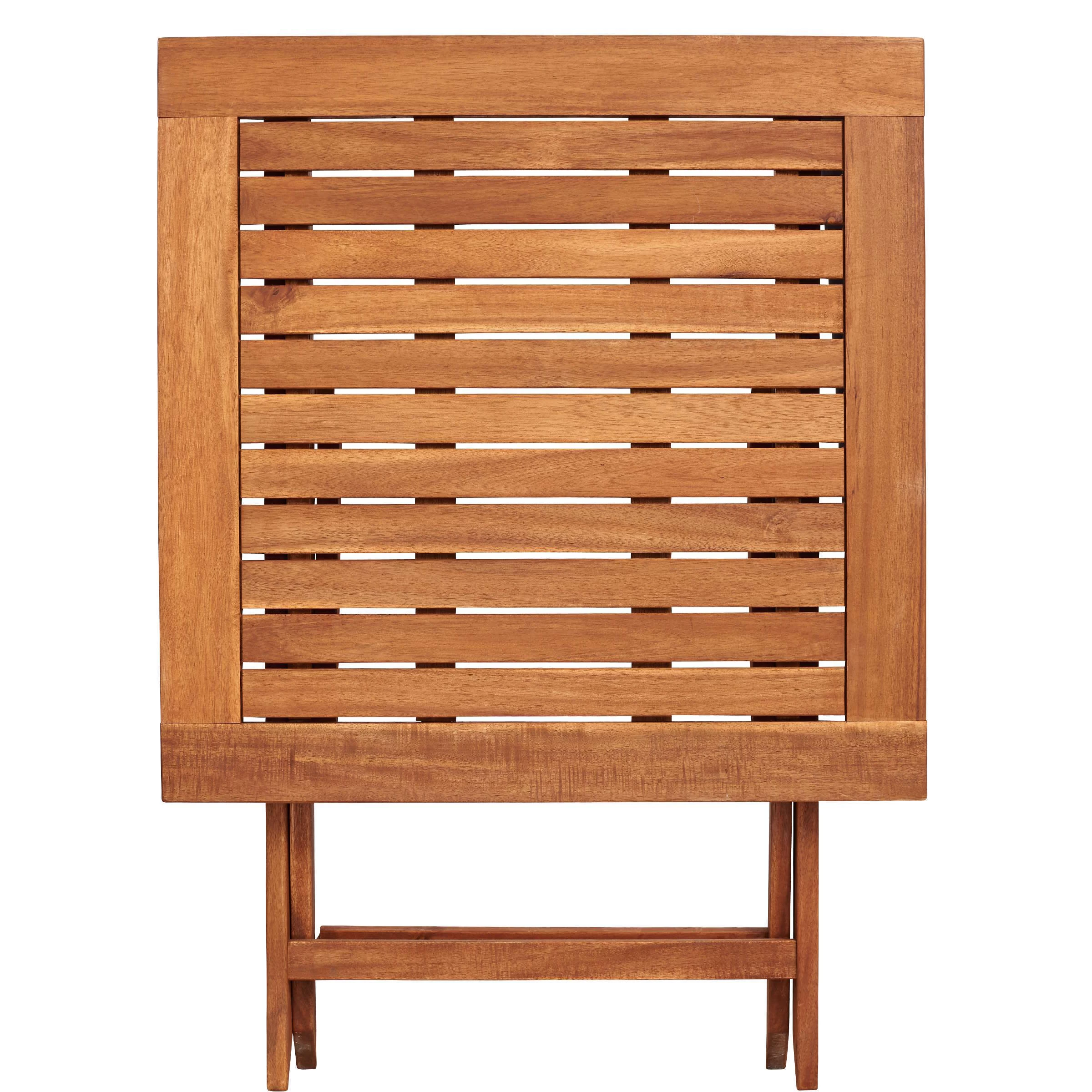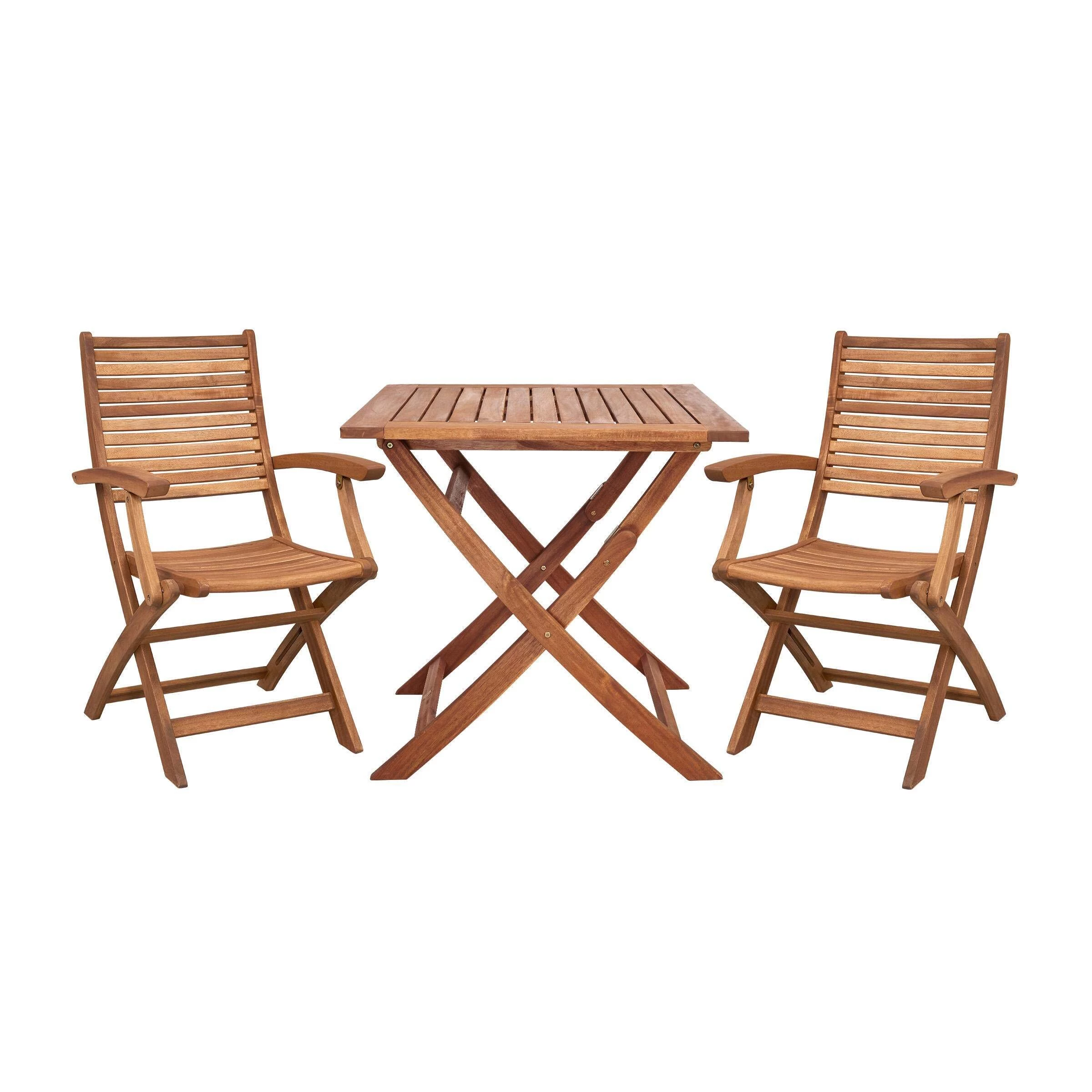 Dieses 3-teilige Gartenmöbel-Set bestehend aus einem Tisch und zwei Klappstühlen mit Armlehne aus Akazienholz lässt sich einfach transportieren, aufstellen, wegräumen – und kommt mit seiner engen, leicht geschwungenen