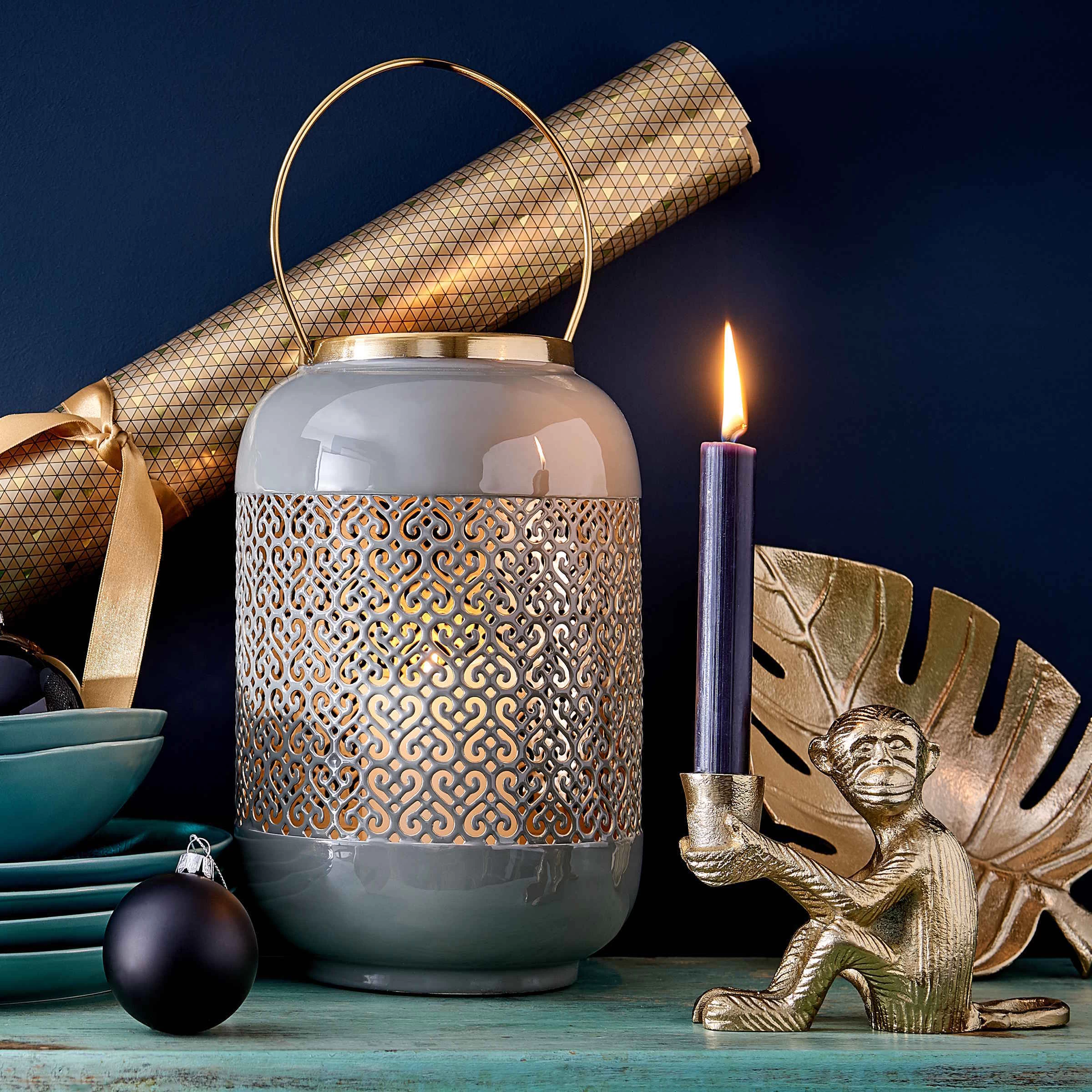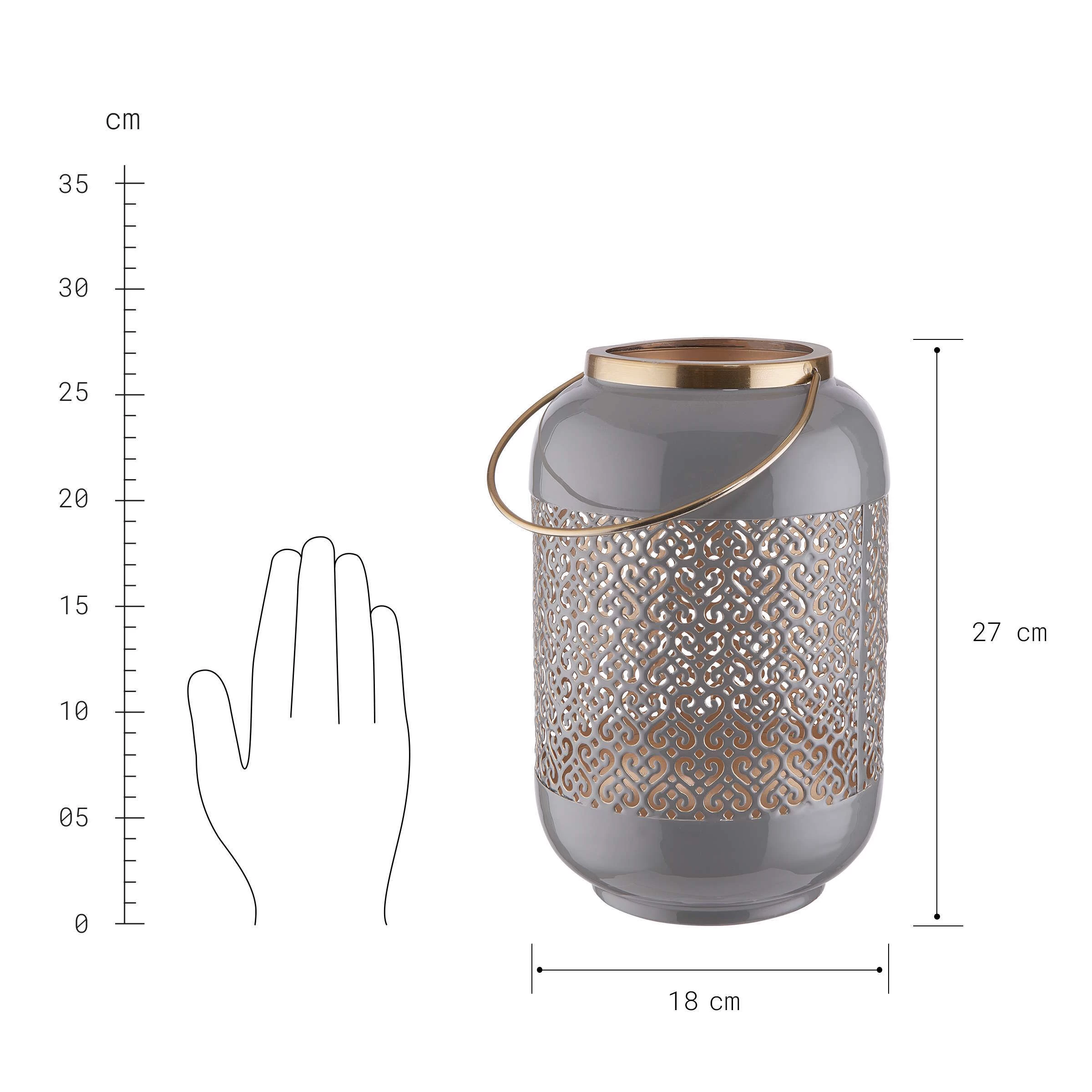 Metallische Effekte und durchbrochene Ornamentik: Als stylische Deko-Queen lässt es die Emilie Metall Laterne so richtig funkeln in Ihrem Zuhause, zum Beispiel auf Regal, Anrichte oder Sideboard. Oder Sie nehmen die schöne Laterne abends mit auf Balkon oder Terrasse und genießen gemeinsam romantische Stunden.