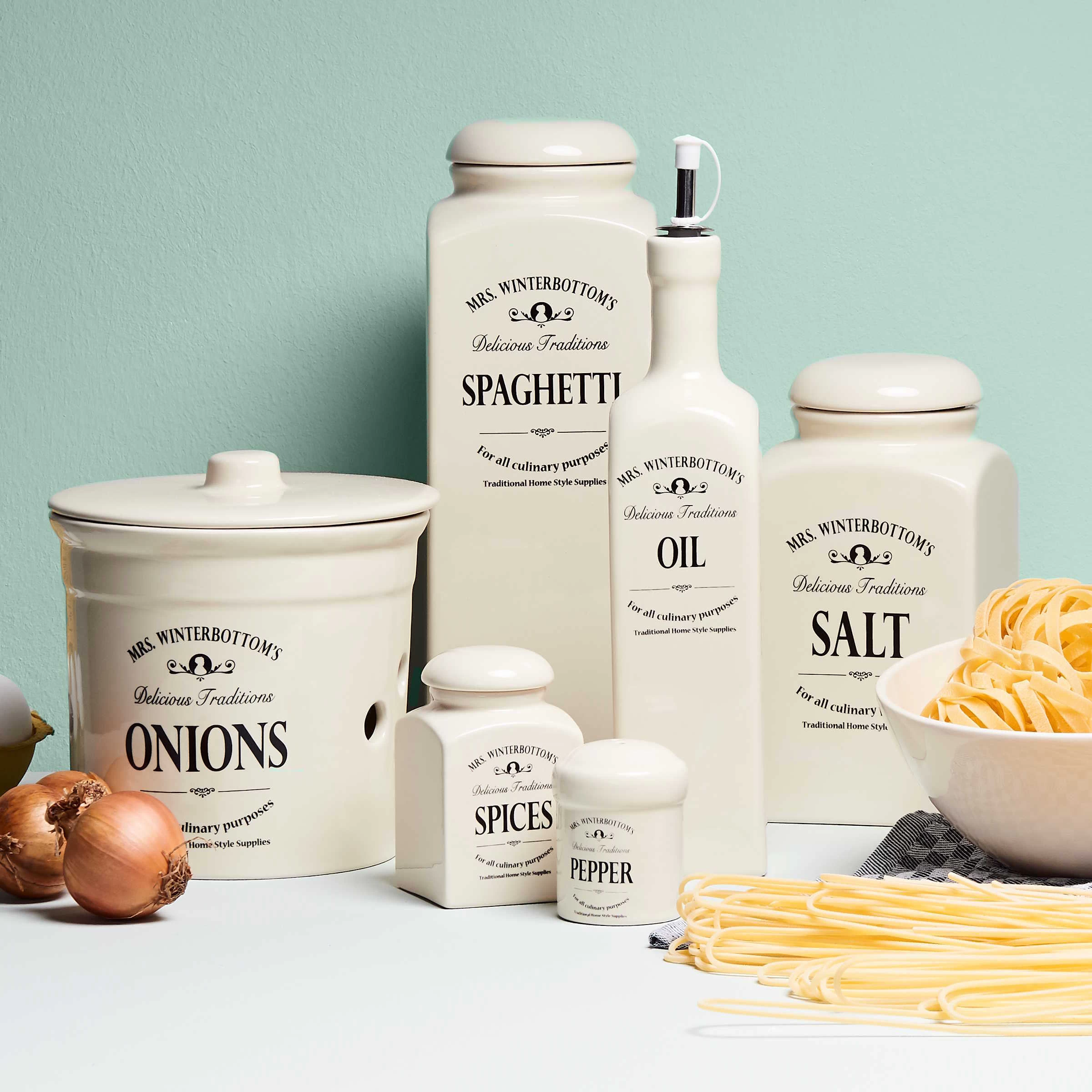 Weil die Essigflasche alleine so verloren aussieht, kommt hier die passende Ölflasche dazu. Abnehmbarer Ausgießer. Bei der Serie Mrs. Winterbottom’s ist an alles und jeden gedacht. Dies und das lässt sich mit den traditionellen Dosen, Flaschen, Töpfen, Schalen, Kannen etc. aufbewahren und/oder auftischen. Jedes Teil ist aus Steinzeug exklusiv für Butlers gefertigt und trägt ein typisch englisches Dekor. Und natürlich passt alles so perfekt zusammen wie die Deckel auf die Töpfe oder die Metallausgießer auf die Flaschen.