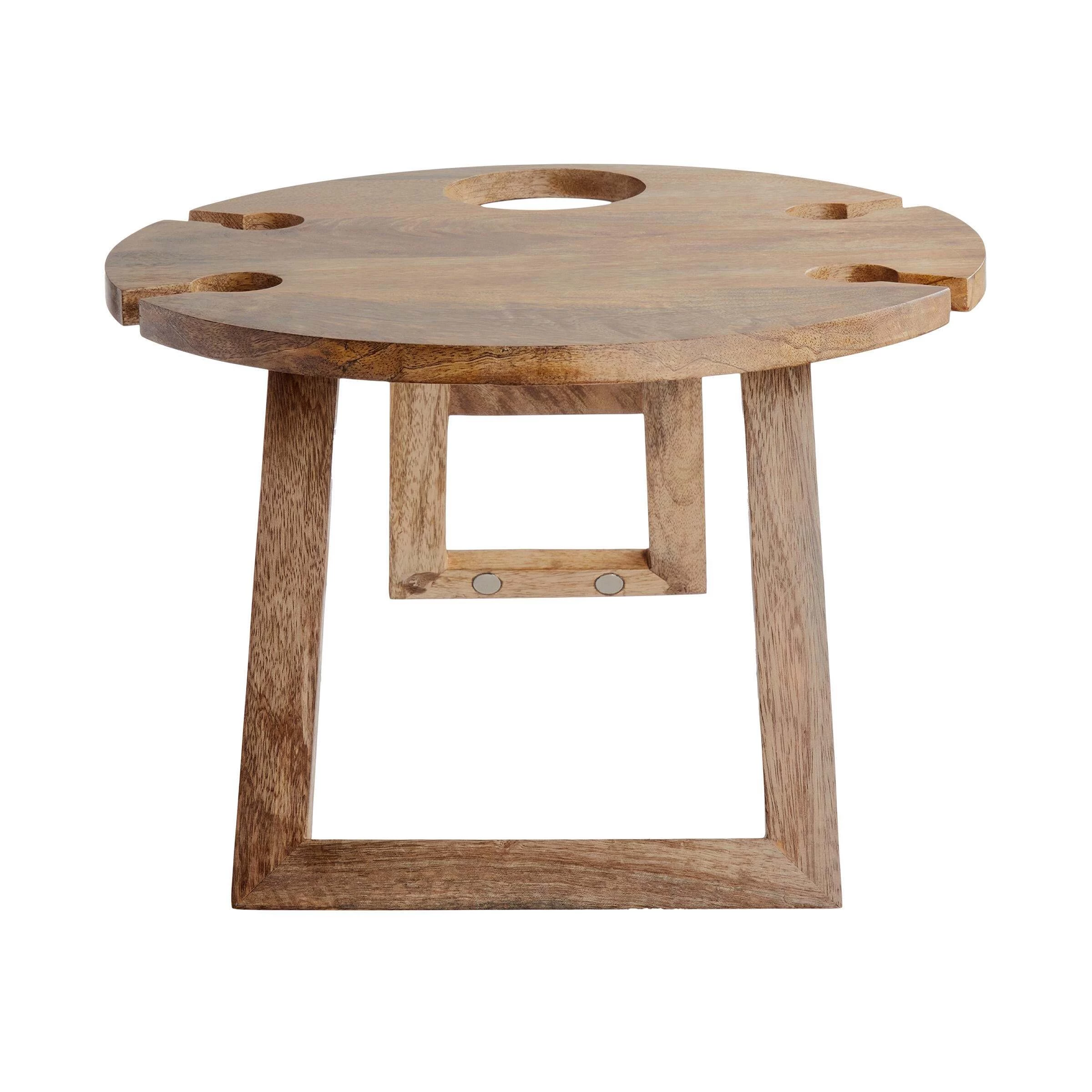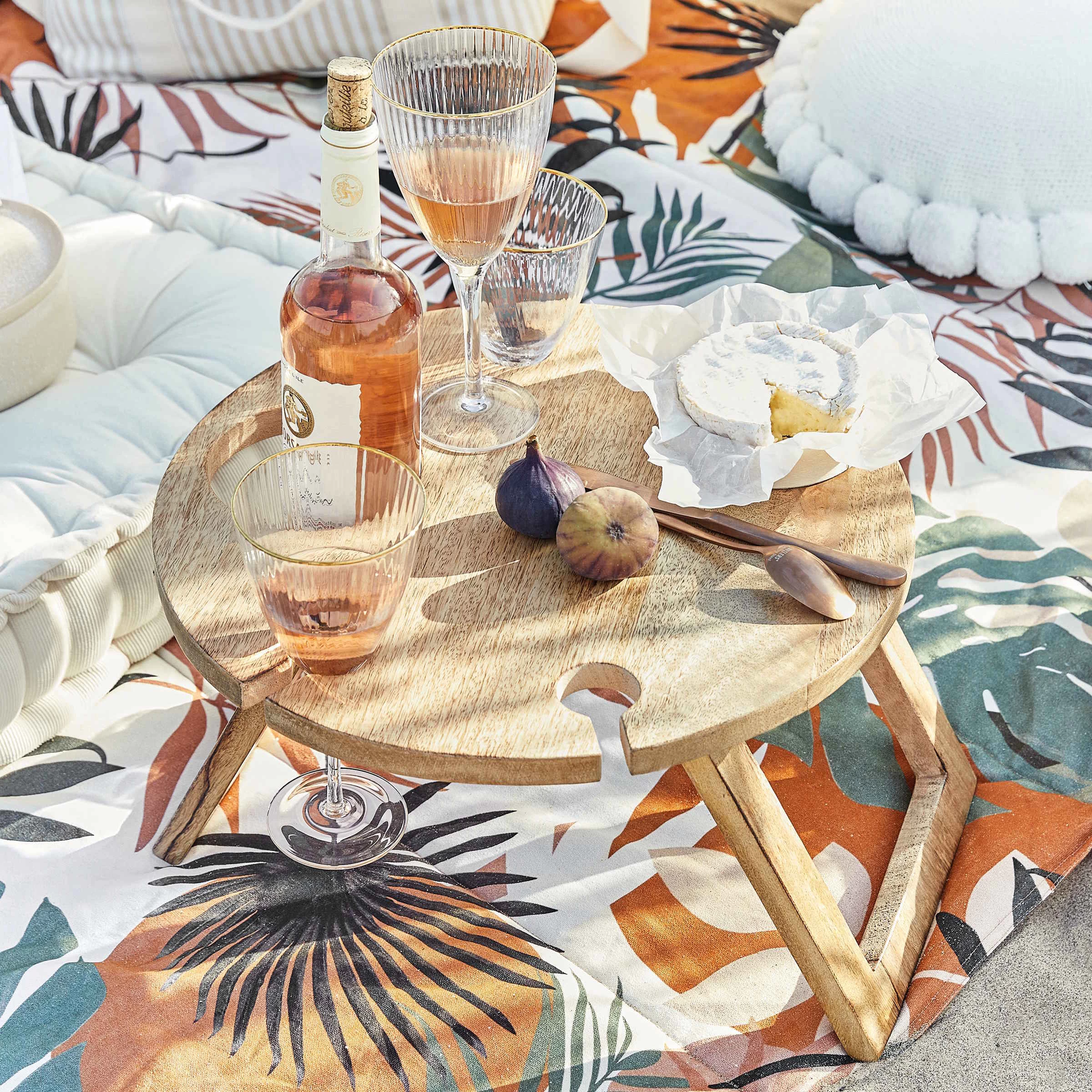 Geburtstage und andere Feste feiert man gerne im Park – und das stilvoll mit dem Chin Chin Picknicktisch mit Halterungen aus Mangoholz. 4 Stielgläser, etwa Wein- oder Sektgläser, und eine Flasche lassen sich in diesen Halterungen ziemlich sicher parken, und für kleine Snacks ist auf der Tischplatte auch noch Platz. Zum Transportieren falten Sie den kleinen, runden Tisch einfach zusammen, und so kann er platzsparend verstaut auf seinen nächsten Einsatz warten.