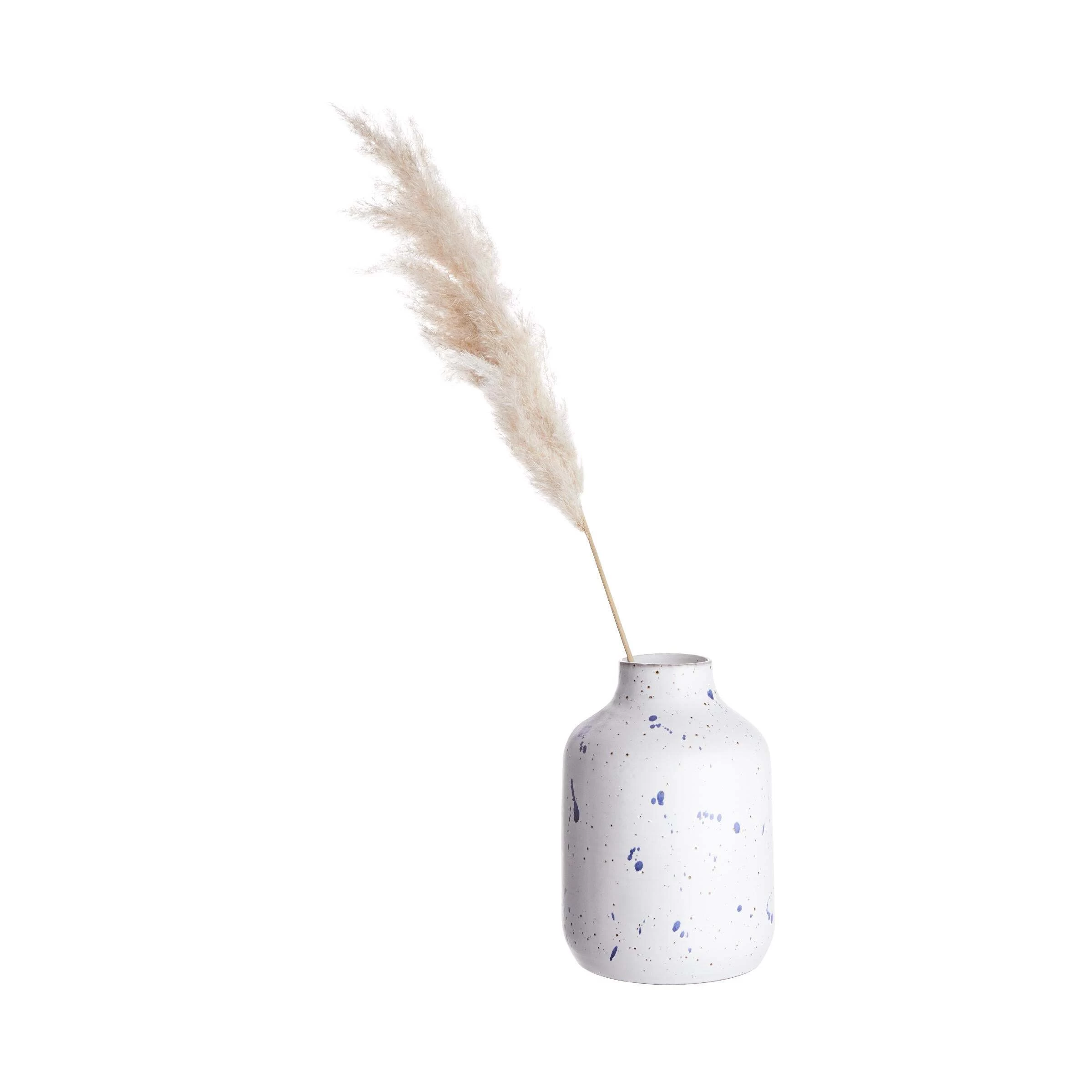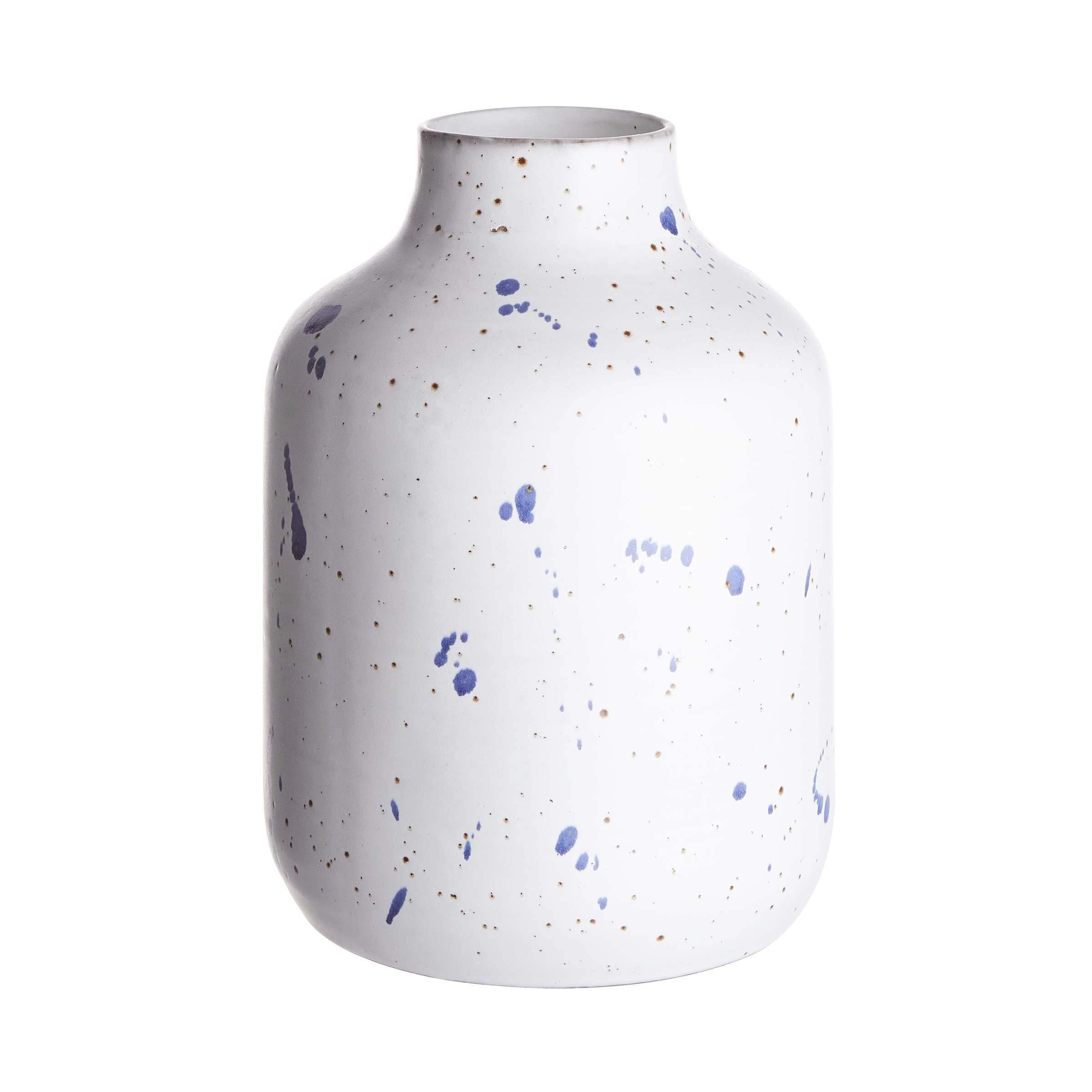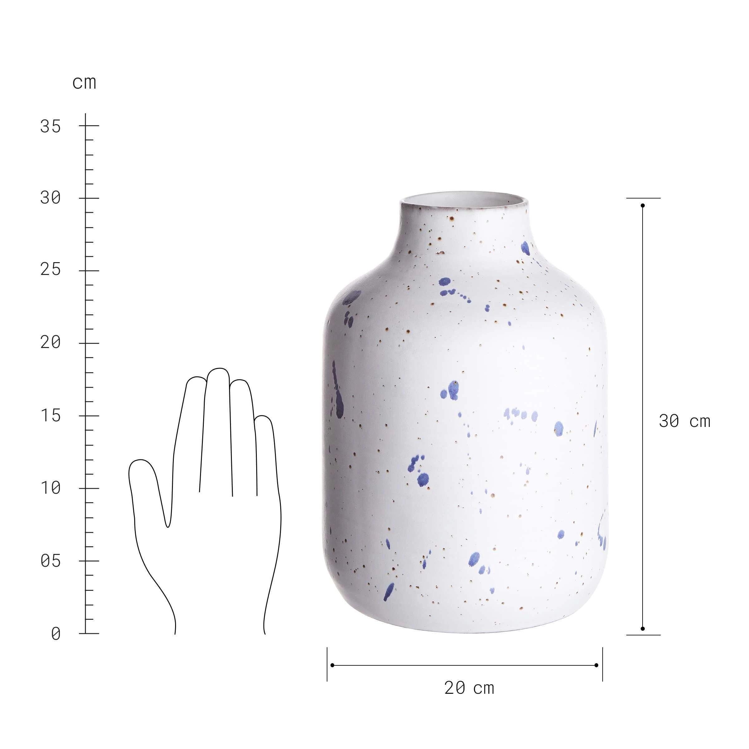 Kleine blaue Farbtupfer verteilen sich mal hier, mal da auf der weißen Splash Keramik Vase mit Sprenkeln. Ganz zufällig wirkt dieses Muster, das die authentische Form der 30 cm hohen Vase unterstreicht. Ideal für das moderne Zuhause im Skandi-Style oder im natürlichen Look.