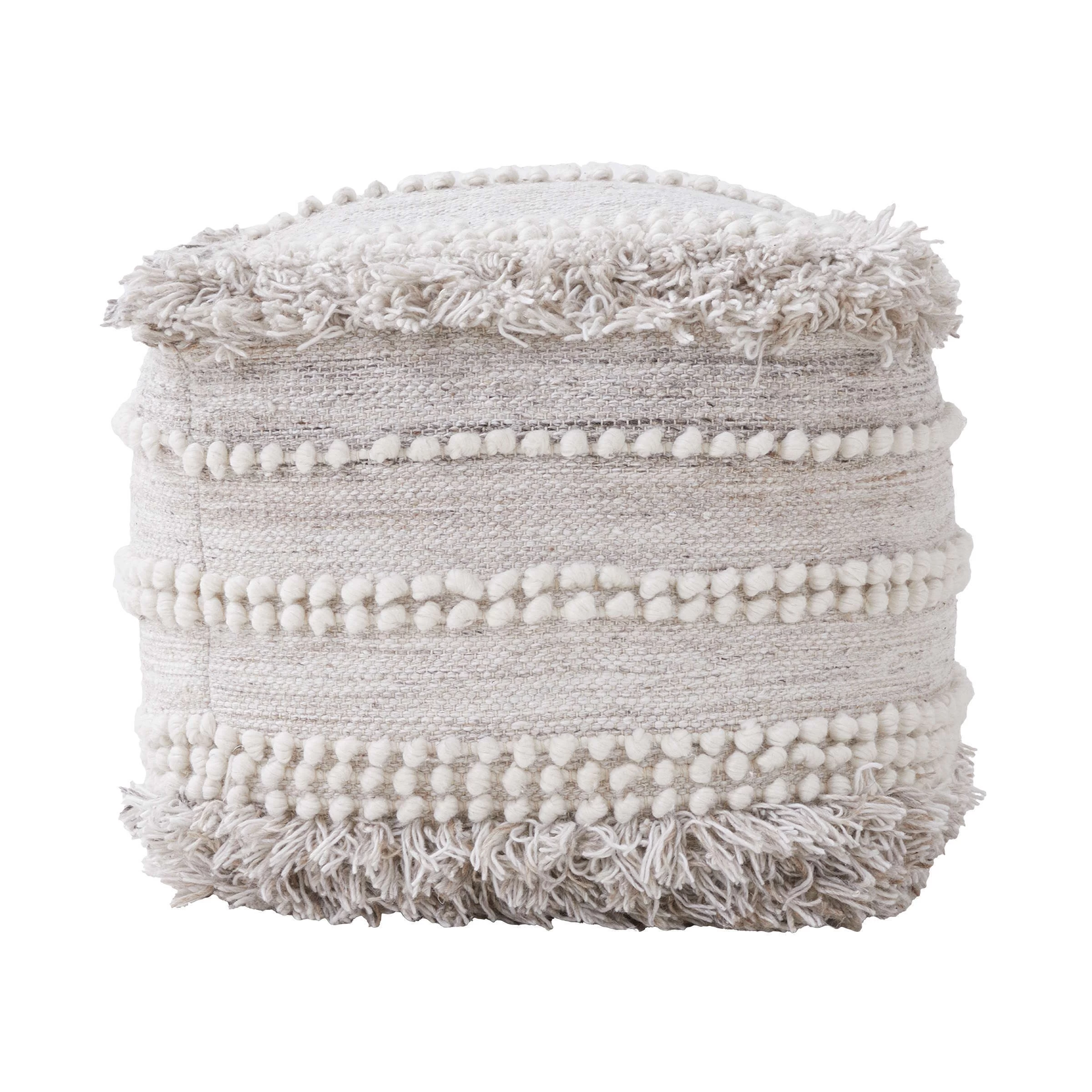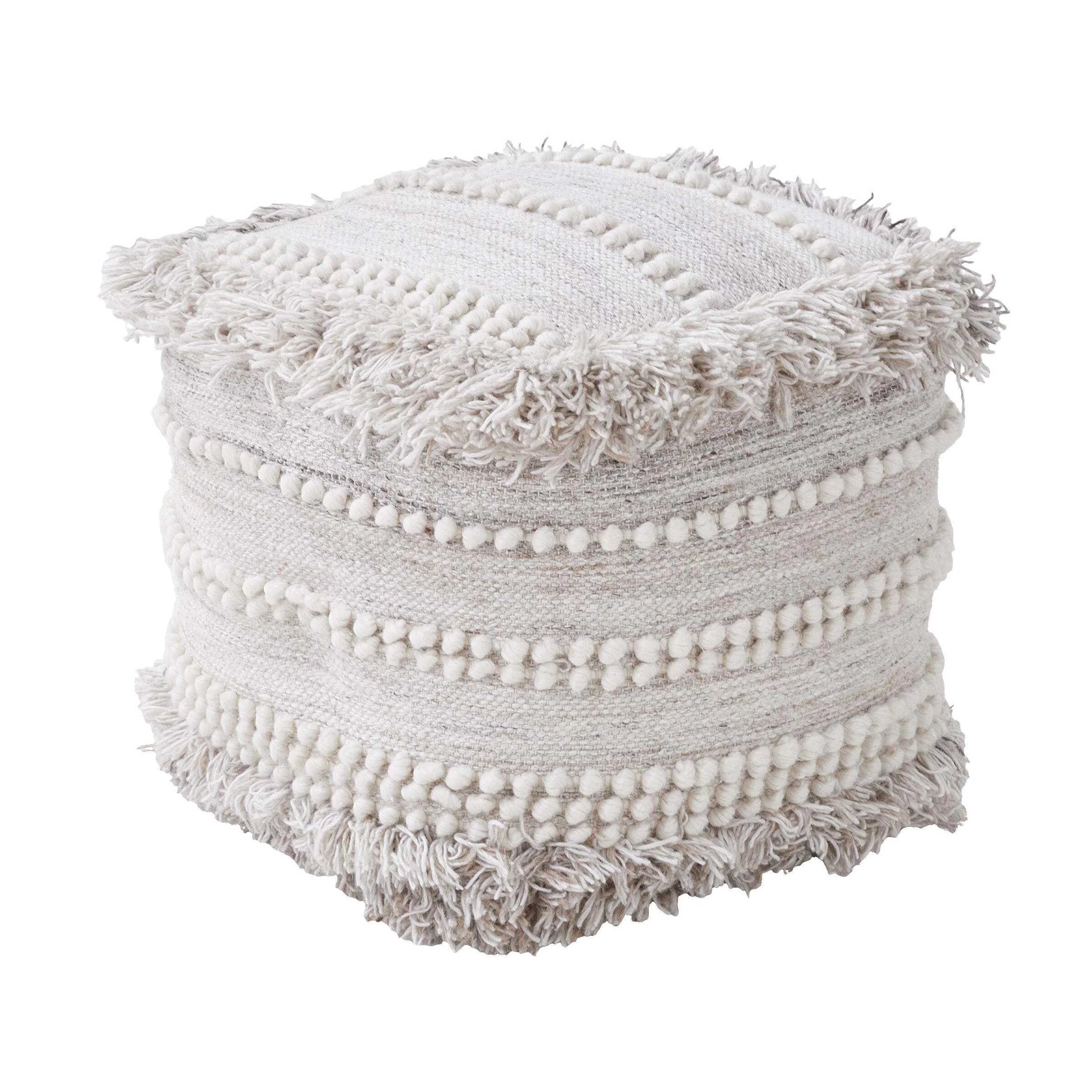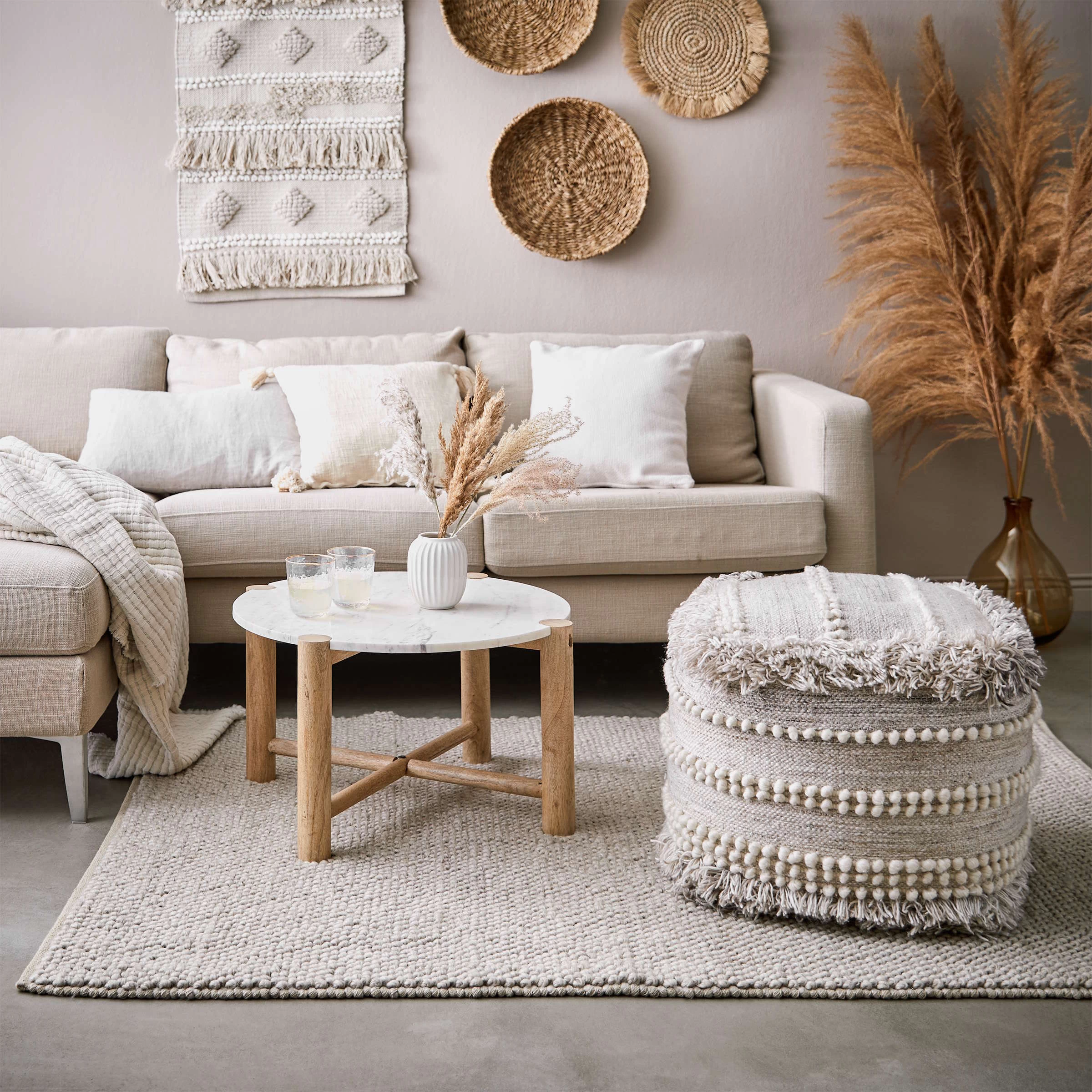 Mal eben Platz nehmen, die Füße hochlegen oder ein paar Bücher ablegen – der cremefarbene Boho Lounge Woll-Pouf mit Troddeln macht das Wohnen und Wohlfühlen so herrlich unkompliziert. Dabei sieht er mit seinen Fransen und Bommeln auch noch umwerfend aus – typisch Boho und ungemein lässig passt er wunderbar in den Wohnbereich, in den Flur und ins Schlafzimmer. Dabei gesellt er sich gerne zu Korb- und Rattanmöbeln, zu Bambus und naturfarbenem Holz, zu bunten Kissen und dekorativen Teppichen.